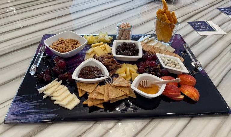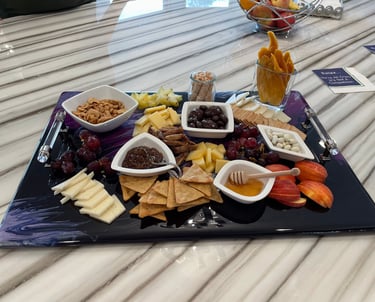 Abstract acrylic epoxy pieces ranging from vibrant wall art to functional charcuterie boards and drink coasters.